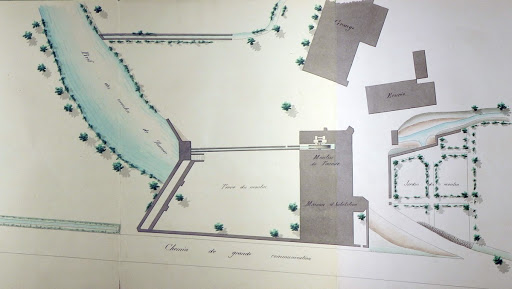 | Plan de 1870 dans sa vision globale du site. Sur la gauche on peut voir le bief, puis l’aqueduc de bois qui amène l’eau au moulin, et enfin à droite l’écoulement qui rejoint le lit de la rivière La Bédoire. Archives Départementales d’Indre-et-Loire. |