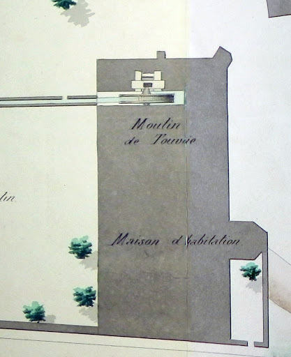 Plan de 1870, faisant apparaître l’emplacement de la roue à aube, à l’intérieur de la maison d’habitation dont une partie a été consacrée au moulin proprement dit. Archives Départementales d’Indre-et-Loire. |