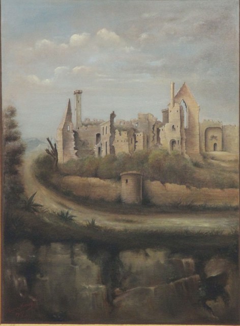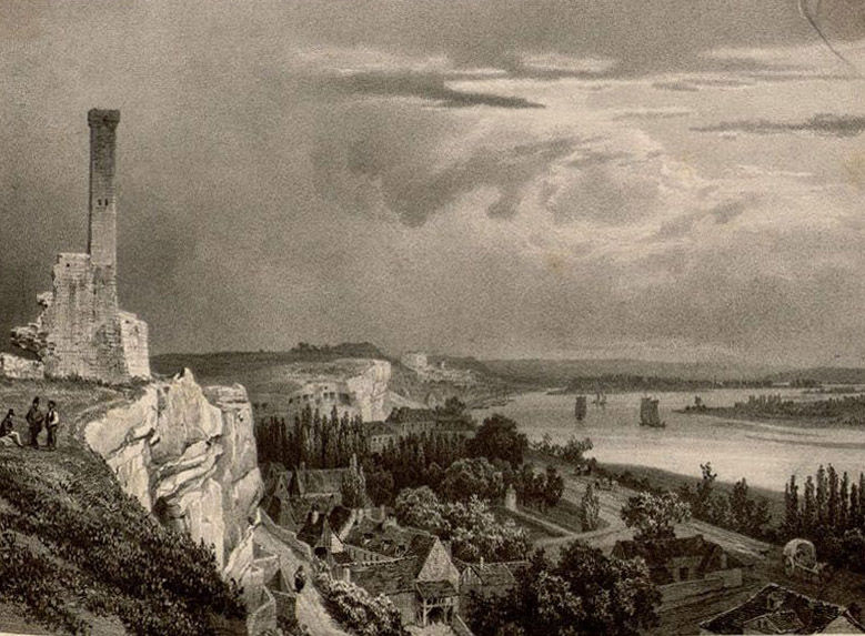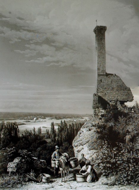 | Ruines du château de Rochecorbon telles qu’elles sont peintes à la mairie de Rochecorbon (d’après Charles-Antoine Rougeot). |