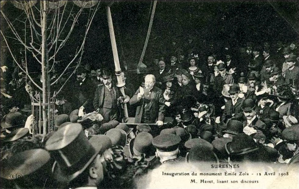 En 1908, le 12 avril, un monument est érigé à la mémoire de Zola, deux mois avant son entrée au Panthéon et l’attentat contre Dreyfus. C’est Louis Havet qui est choisi pour l’inéluctable discours.
