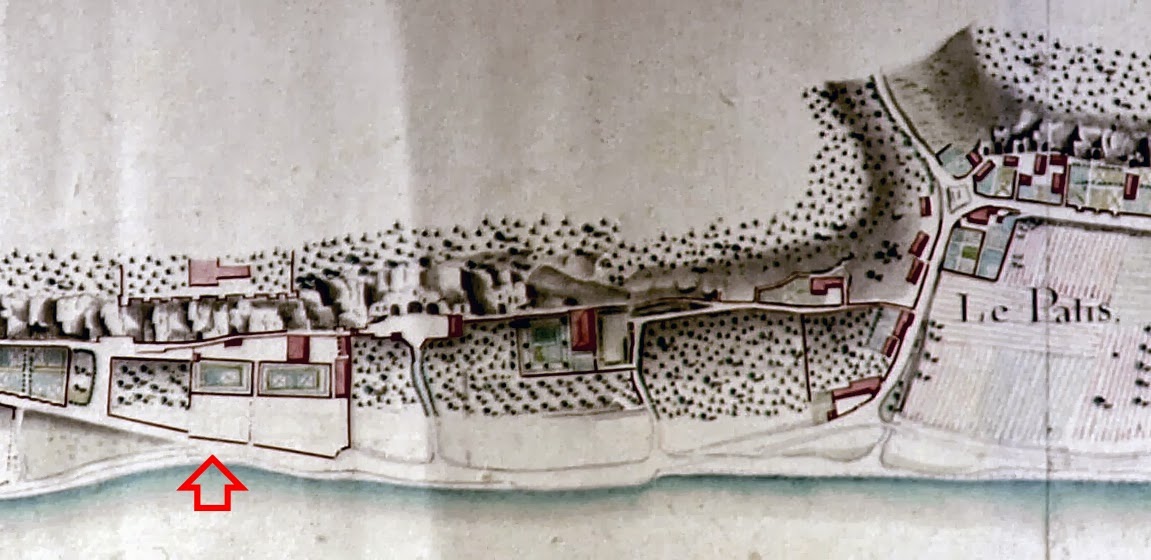 Cette carte montre le coteau à cette époque, alors que la levée, digue de protection contre les crues de la Loire, n’existe pas encore. On peut y voir les lieux troglodytiques indiqués par de petites tâches noires au pied du coteau, les maisons dessinées en rouge sont rares. À l’emplacement du futur clos, désigné par la flèche rouge, on distingue un jardin à la française dépendant d’habitations éloignées le plus possible du fleuve impétueux.