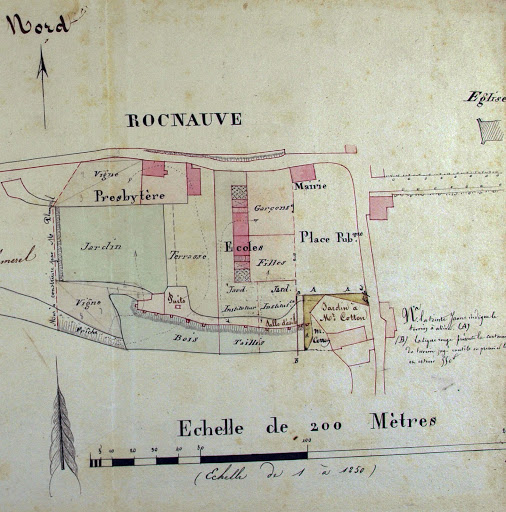 La maison du Crochet n’étant que provisoire on rechercha un terrain pour y construire des installations appropriées. Après plusieurs tergiversations, on se fixa sur le terrain de Rocnauve. Il est parfaitement situé, proche de l’église, et permet d’y créer le bâtiment des écoles, la mairie, y accueillir le presbytère et implanter une place.