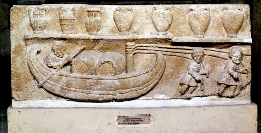 Lintre gauloise; Le bateau à fond plat, à poupe et proue élevées se prête à la navigation fluviale et au hallage. Noter la présence de tonneaux dont l’invention est attribuées au x Gaulois