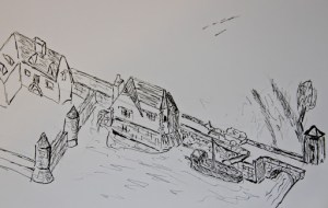 La rue du moulin, qui traverse cette image de haut en bas; passe au dessus du canal qui alimente la roue; elle se trouve surélevée sur sa droite comme sur sa gauche (où on peut voir le déversoir du bief; aujourd’hui pour construire les HLM on a enterré ce déversoir). la partie droite de cette route,devait être autrefois une grève; d’où le nom de « Gravotte ».