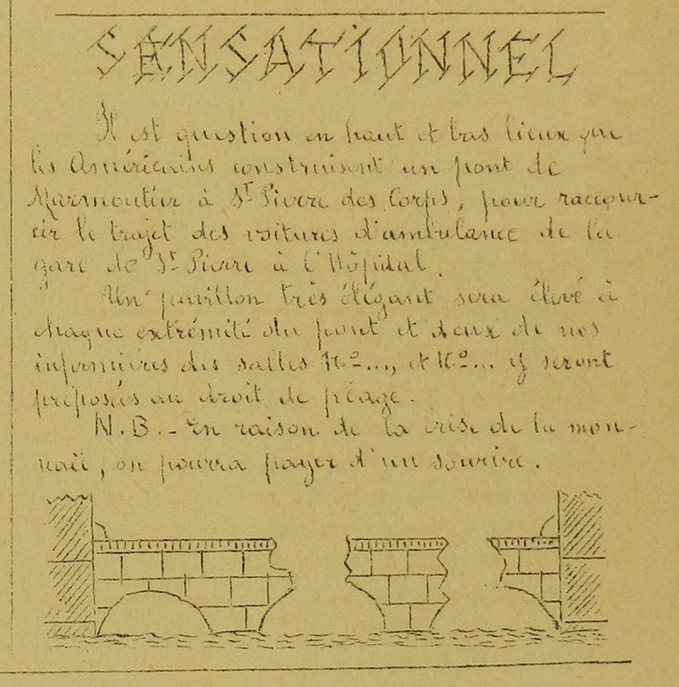 Le premier concerne un travail en cours sur la période de la première guerre mondiale. Marmoutier avait alors été transformé en hôpital pour y soigner les blessés ramenés du front. Pour dissiper leur ennui ces blessés éditèrent un petit journal, une feuille de chou comme ils la surnommaient, intitulé Marmoutier-Gazette (Archives départementales d’Indre-et-Loire, 219PERU1) : avec un ton humoristique ce journal raconte la vie de l’hôpital, chambrée par chambrée, les petits potins, l’actualité des conflits, etc. Illustré de dessins et caricatures il se vantait cependant de n’avoir jamais été censuré, chose bien rare à cette époque de guerre.