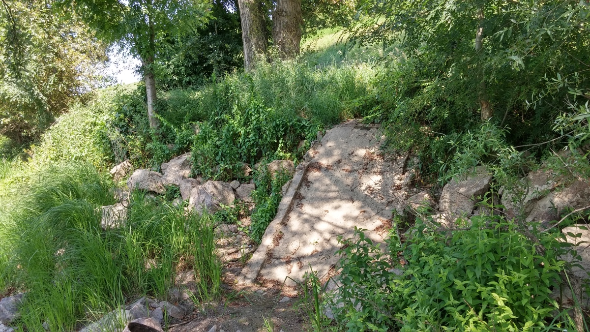 Que nous dit cette plaque de béton avec ses deux rebords ? Ce n’est pas une rampe d’accès à la Loire, elle est bien trop inclinée, trop pentue. Elle ne pose pas directement sur le sol, elle semble s’être écroulée.
