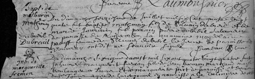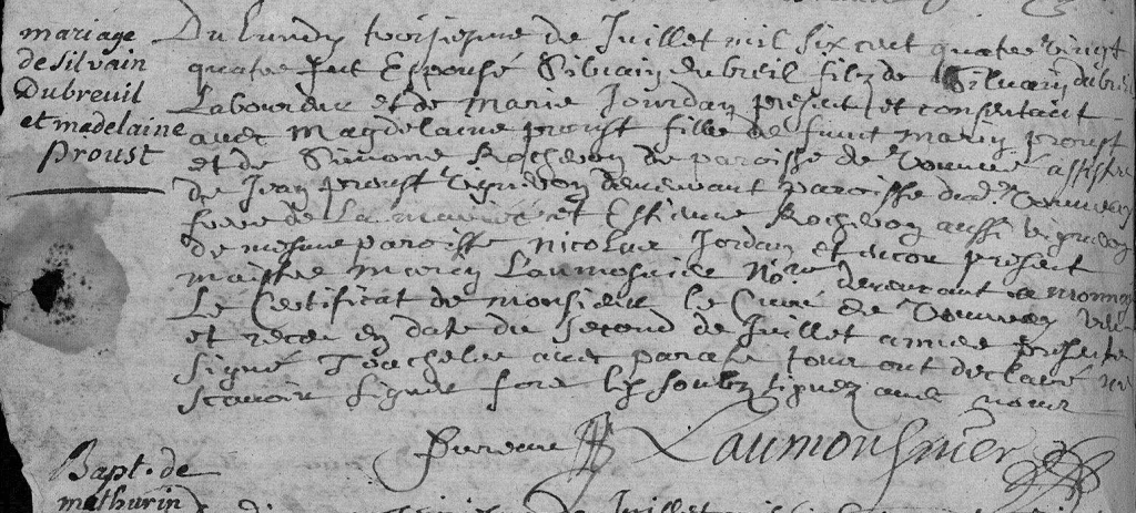 Le premier est le nom de la mariée: « Du Lundy troisième de juillet mil six cent quatre vingt quatre fut espousé Sylvain Dubreuil fils de Sylvain Dubreuil laboureur et de Marie Jourdan présent et consentant, avec Magdelaine Proust fille de defunct Marin Proust et de Simone Rocheron de paroisse de Vouvré … ».