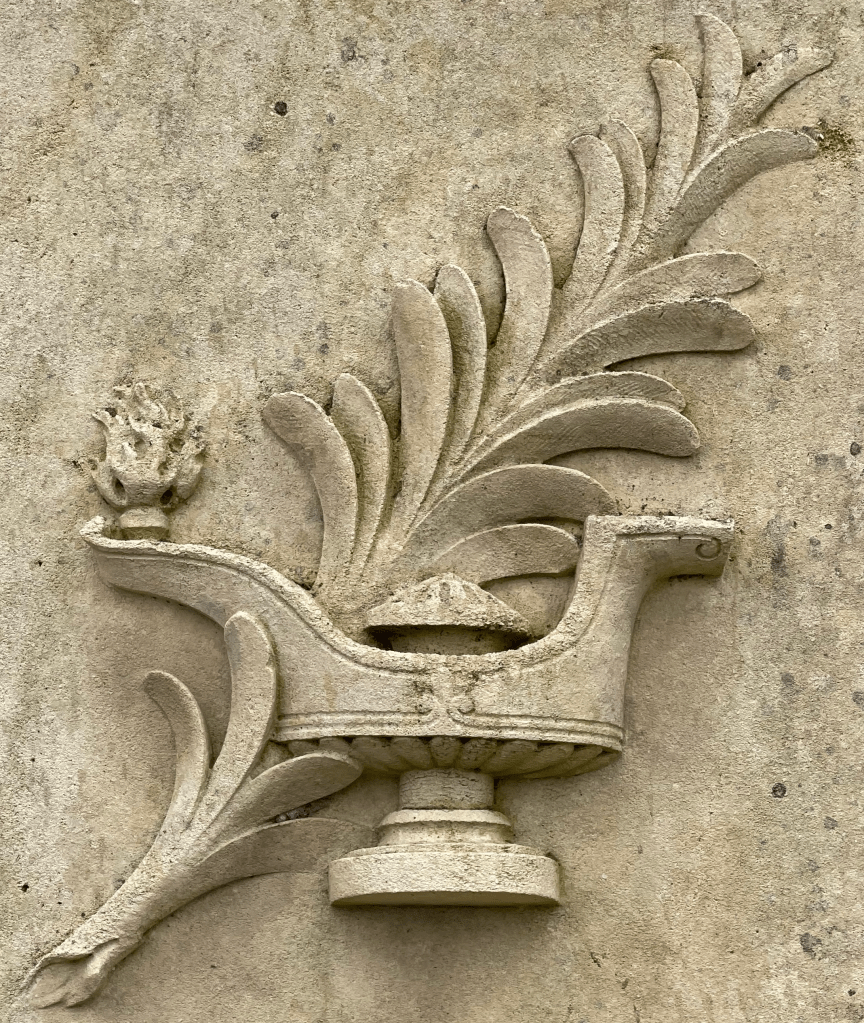 Le motif au premier plan est une lampe à huile, symbole de la mort avec la flamme symbolisant l’âme (si on est croyant) ou l’esprit (pour les autres) qui s’échappe du corps, la lampe (le corps) restant sur terre. Par ce motif il s’agit bien d’honorer les morts. Mais au second plan figure une grande palme qui est le symbole de l’honneur, du champ d’honneur. L’ensemble commémore donc les morts au champ d’honneur, à la guerre. Cet ensemble est assez classique sur les monuments aux morts.