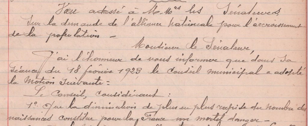 Le PHARE n’a aucunement l’intention d’entrer dans le débat politique bien actuel : faut-il ou ne faut-il pas inciter un « réarmement démographique », euphémisme rhétorique de « relance de la natalité » ? Notre travail étant d’interroger l’Histoire, remettons-nous en 1923 pour découvrir dans le Registre des délibérations de la commune de Rochecorbon 1904-1924 cette délibération toute actuelle un siècle plus tard :